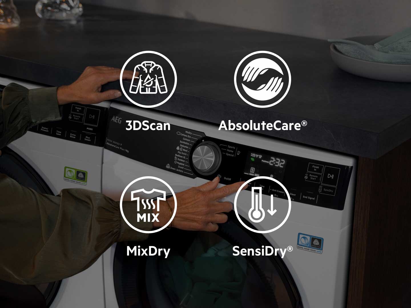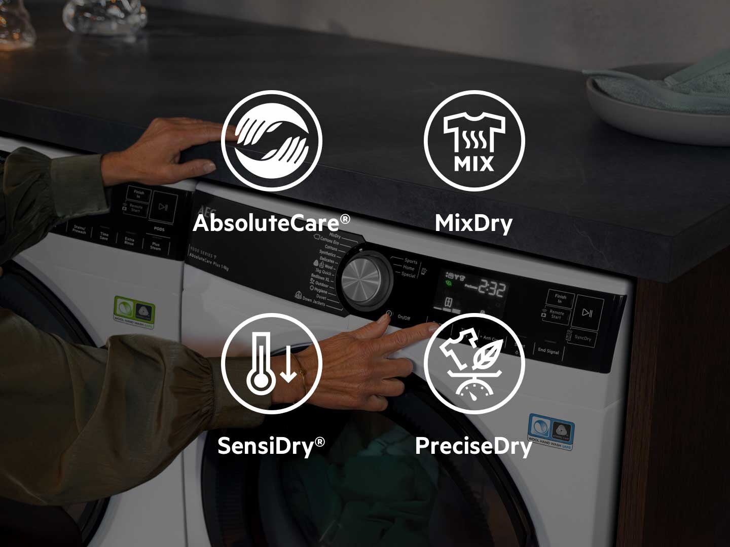AbsoluteCare® използва технология с термопомпа, заедно с прецизни движения на барабата и настройки на температурата, които сушат дрехите Ви по безопасен начин, дори и деликатните материи. Гарантира, че вълната няма да се свие, а коприната няма да изгуби формата си. Възстановява водоустойчивостта на екипировката и е сертифицирана с Woolmark Blue.