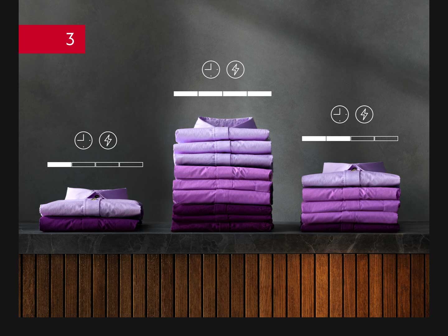 3D Scan технологията: *Въз основа на външен тест за термична устойчивост за артикули, изсушени с технологията 3DScan, извършен съгласно ISO 11092. **Prosteam: Вътрешен тест според вътрешния тестов метод показва до 40% намаляване на гънките върху 100% памучна тъкан след ProSteam® цикъл.