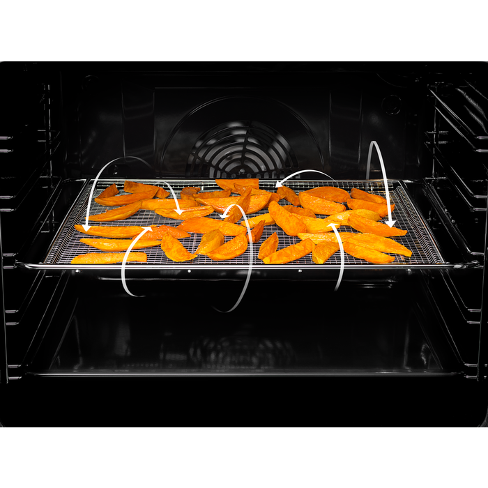 Наслаждавайте се на хрупкави и равномерно сготвени ястия като картофи, зеленчуци и пилешки крилца, с малко или без мазнина, с мрежестата тава за фурна AirFry. Специалната мрежеста структура способства за по-добрата циркулация на въздуха и непрекъснатия въздушен поток. Няма нужда да обръщате храната.