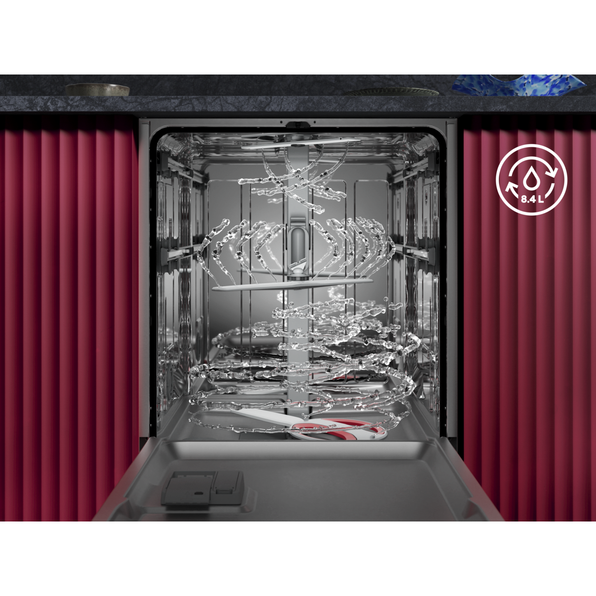 Серия 8000 осигурява мощно почистване за отстраняване на упорити или засъхнали остатъци от храна. Мултифункционални, гладко плъзгащи се кошници със сгъваеми отделения и уникални държачи за чаши. Високоефективната водна система използва само 8,4 литра вода.