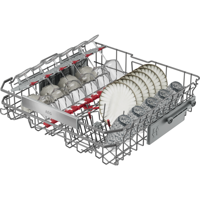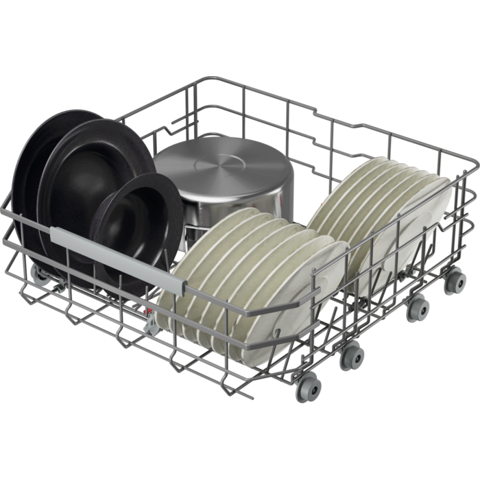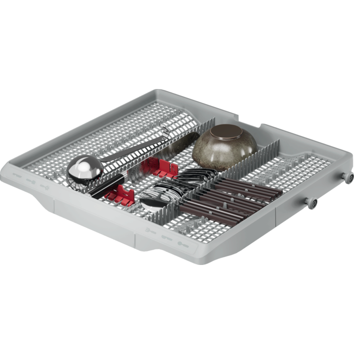 Кошниците с преработен дизайн EasyFlex Plus се плъзгат плавно и имат три сгъваеми държача, за да освободят място за труднопобиращи се предмети. Гумените хватки и шипове против плъзгане задържат чашите на място и предотвратяват удари. Чекмеджето за прибори за хранене събира дори бъркалки и черпаци.