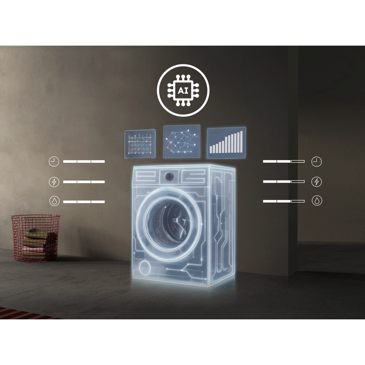 *На база алгоритъм за откриване теглото на зареждането, предварително обучен с различни видове зареждания. Потребителски данни не се използват за обучение на AI. ** Вътрешен тест за потребление на време, вода и енергия при „Памук 30°C“, оптимизирана с AI WashAssist за 1 кг спрямо макс. зареждане.