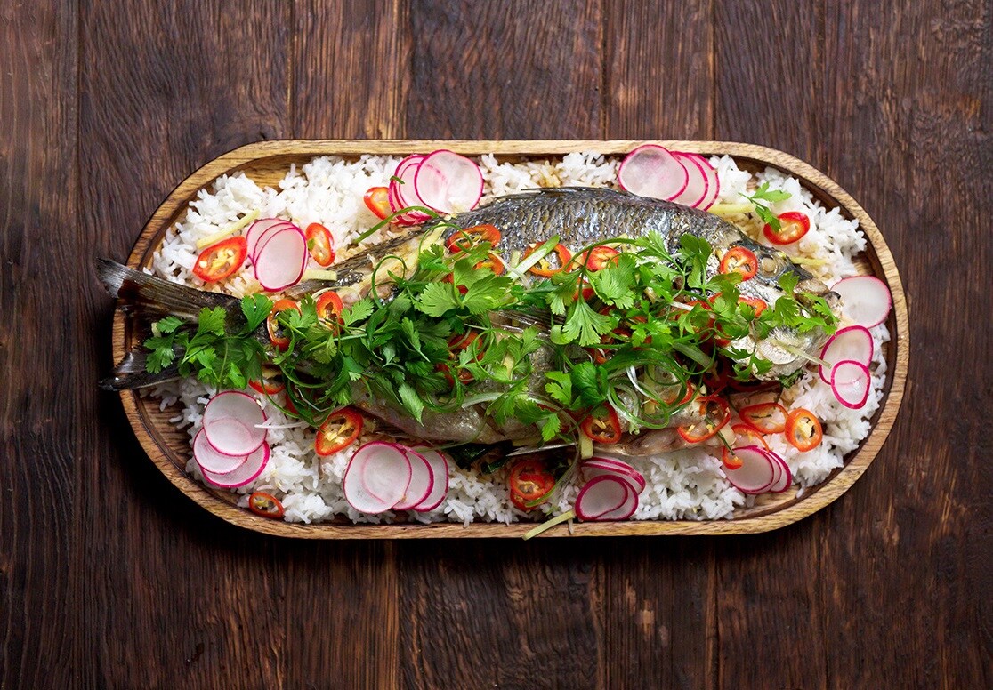 Страхотна рецепта за скариди, приготвени на плоча AEG, със сос от чесън, лайм и чили, сервирани с басмати ориз, кориандър и пресен лук.